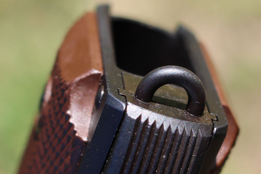 With the branded side down you would be hard pressed to not think this was an exceptionally clean WWII era 1911. The grips are correct, all the A1 updates are there, it sports a Parkerized finish–it looks right and the fit and finish is well inline with the originals and actually a bit better than some war time production guns. It is a good looking and shooting American made 1911A1. but flip it over and you’ll see all of the commemorative details.