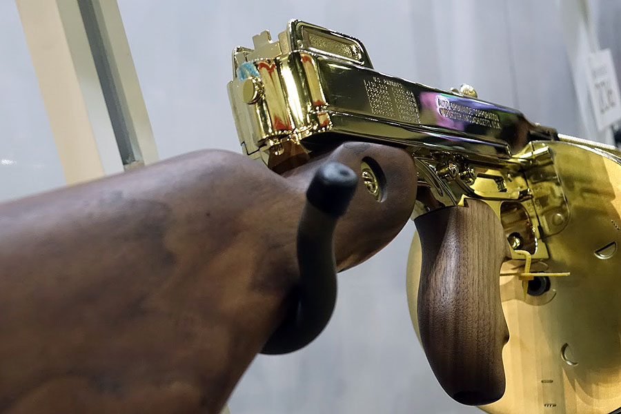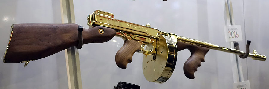Kahr Firearms Group has proudly preserved the legacy of Auto-Ordnance Corporation, the original maker of the Thompson submachine gun. For 2016 Auto-Ordnance is offering new finish options to the T150D line of Tommy Guns. The T150DTG is the Titanium Gold model with all the classic details of the time-honored original. The wood is beautiful American walnut. The frame and receiver are machined from solid steel and finished in titanium gold. It will come with a 30 round stick magazine and a 50 round drum. Due to the fact that the Titanium Gold finish is done by an outside company, A.O. is expecting only 15 to 20 available each month for purchase. The retail price will be roughly $2500 . Unfortunately for those of you in New York and Connecticut, Tommy Guns are prohibited.