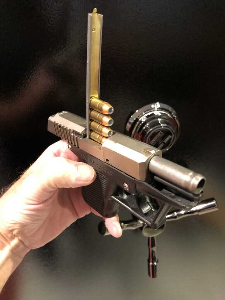 Let’s start small and work our way around. The gun that pushed so many other gun makers to follow Kel-Tec’s lead was the diminutive P-32 in 32acp. How did it push??? Well at the time of introduction one of the most sought after “pocket guns” in 32acp was the expensive and heavy-for-size delayed blow-back L.W. Secamp. George’s creative mastery of lightweight building materials and engineering gave us a fly-weight pocket pistol with a real tilting barrel locked breech and a very good trigger at less than a third of the Secamp’s price! Lead, follow or get out of the way!