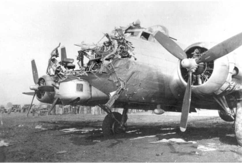 One burst of antiaircraft fire connected with 1LT Knarr’s starboard engine. Both big radials were firewalled during the attack. 1LT Knarr was coaxing every bit of power out of the plants and every scrap of speed out of the plane. Suddenly the number 2 engine sputtered and died streaming oil. The big 11-foot, 3-inch propeller briefly windmilled.