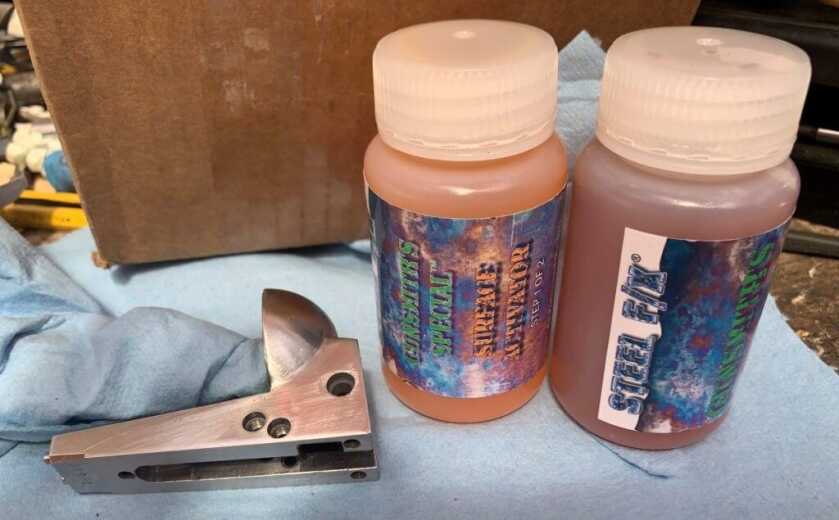 Next is the actual metal coloring process. Applying the liquid patina is a two-step process. You apply the Surface Activator, and then the Gunsmith Special itself. The Gunsmith Special will only react with the surfaces that have the activator on them-meaning the surface has to actually be wet with the applicator. I found this actually helps you keep control of what specific area you want to work on. Then you let the chemical sit on it until it is the color you want. Then wash it off, and blow it off with compressed air to completely dry it. I found that it’s best to do smaller areas at a time, as it’s easier to control how it all looks. I also found that the surface tension of the liquid tended to keep it away from the edges, so it took a couple of tries to get everything colored with no bare spots.