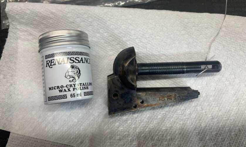 Now that everything is the color you want, it’s time to apply a protective coat. I chose Renaissance Wax, as it’s what SteelFX recommended when I called them, though they mention in the directions that other clear coats could be used. You apply the wax in thin coats and polish it with a clean rag. Apply a little and buff it, repeating this until the whole part is coated. Once this is all done, reassemble the parts and you’re finished.