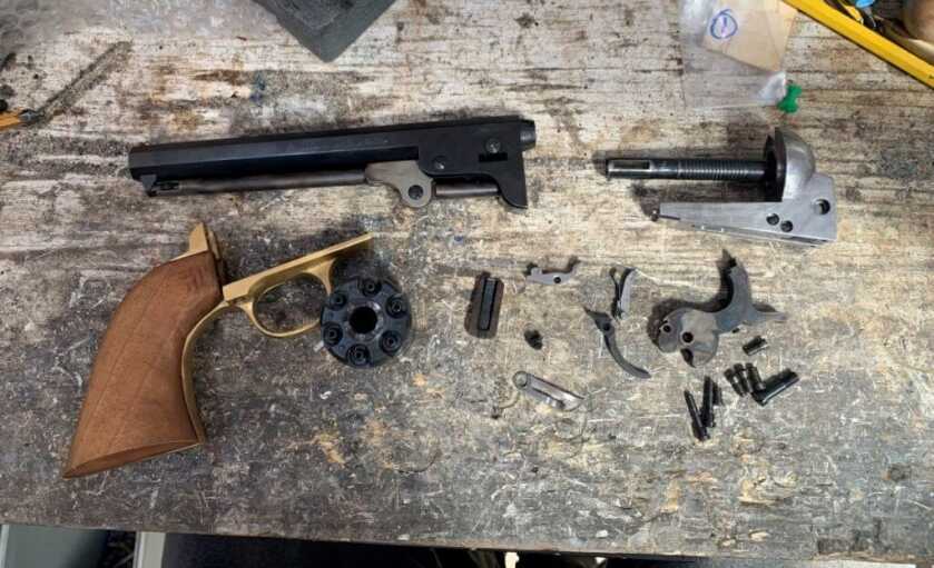 The first step is to completely disassemble the frame or whatever parts you’re working on. If you built a revolver from a kit like this one, then you should be familiar with this process. Then, you need to polish the frame or parts you want to finish. If you’re working on a “kit” revolver like this one, you might have already done a chunk of this when you did the clean-up work on the frame. But I’m going to go over the polishing process some anyway, just in case you didn’t or are using this process on some other project.