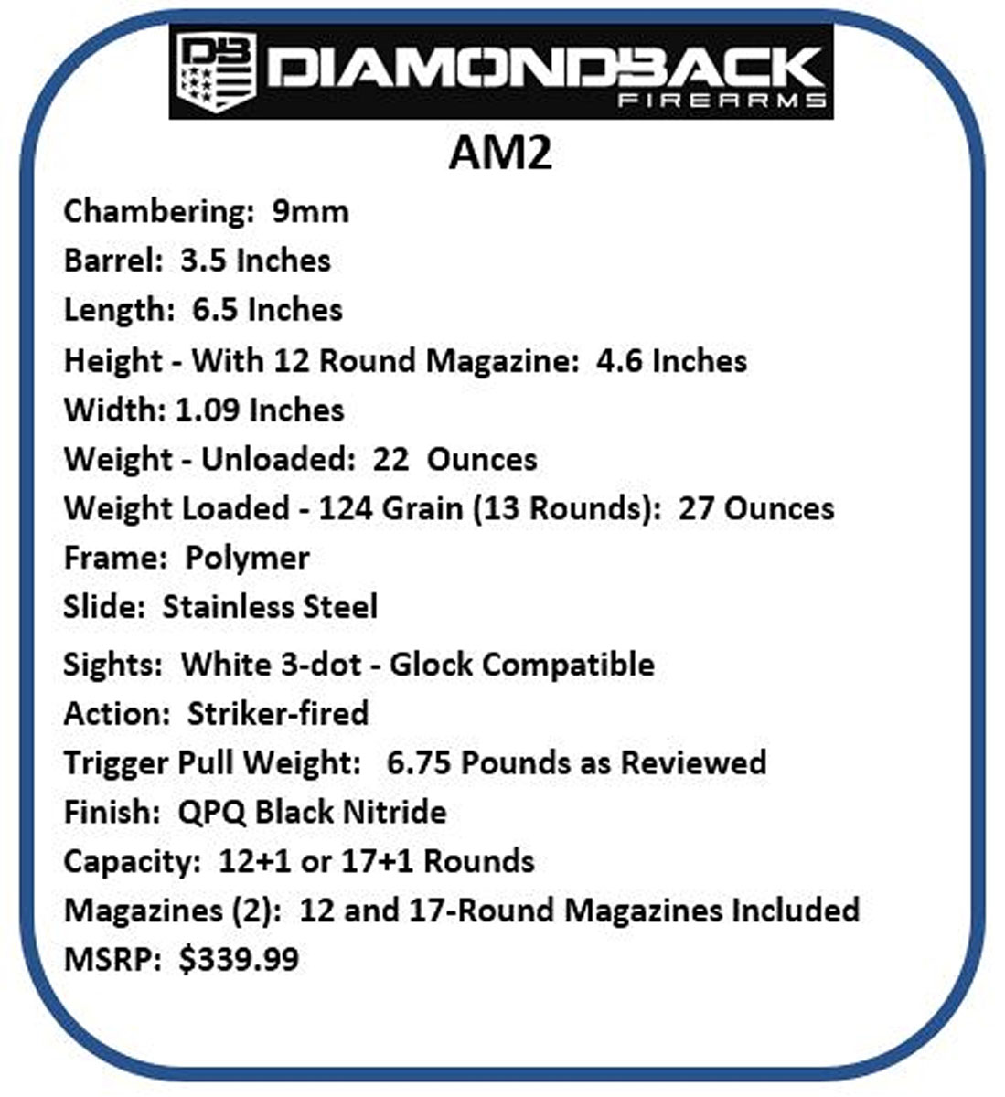The Diamondback Firearms AM2 has an MSRP of $339.99. Current street prices are under $300 and may continue to decline as supply catches up with demand for this new model.