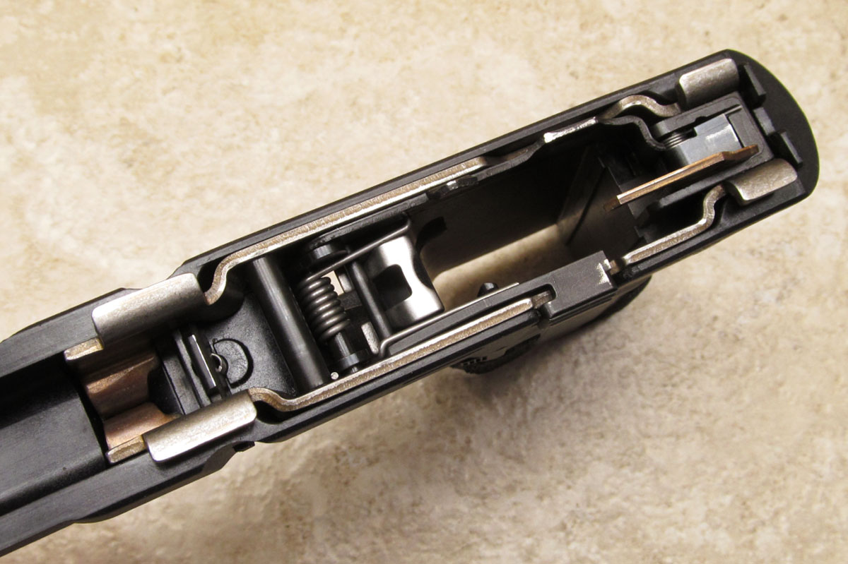Field stripping the AM2 was very easy and similar to the process used with other striker-fired handguns. After pulling the trigger to release the striker, retract the slide a small amount while pulling down on the assembly catch located above the trigger. Release the slide and push forward off the frame. Remove the recoil spring assembly from the slide to allow barrel removal. Reassemble in reverse order.