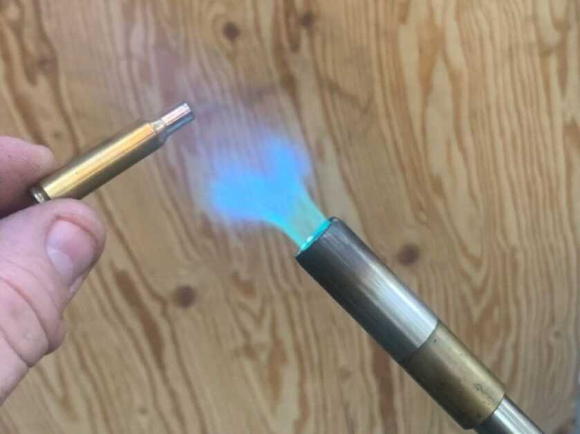 Also, case conversions can work brass significantly in the conversion process. Sometimes this is significant enough to cause cracks in the case within the first or second firing. If you put very much work into converting them, you really don’t want to have to toss your cases after the first time you use them. Annealing these cases will reduce the stress in the cases from working them during the conversion process, making it possible to get decent life out of them.