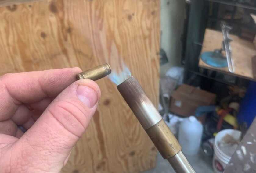 At any rate, I used a simple propane torch to heat the cases, and a container of water to quench them. That’s all you need for equipment for this quenching method. Obviously, you need to be careful to not stick your fingers directly into the flame. You could probably use a butane torch instead, which might be a little easier in that regard. It’s best to place your water so that you just drop the cases straight into it from the flame. That ensures that when you inevitably get the case a bit hot while you’re getting the hang of it, you’re not playing “hot potato” trying to get a piece of hot brass to the water. I also find it’s easier to “see your progress” as the case is heating if the cases are clean when you start.
