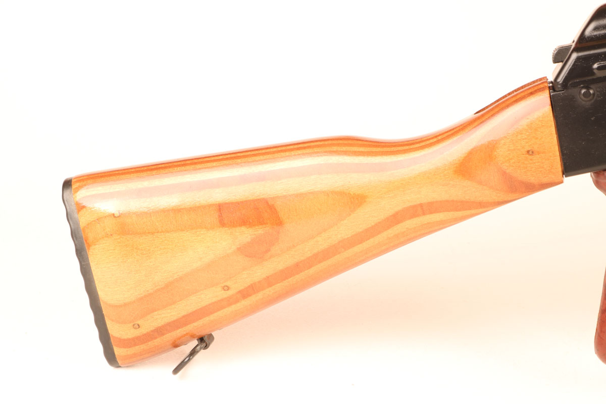 The Maadi AKM features laminated furniture and a thick painted-on black finish. The particulars are classic AKM to include the slanted muzzle brake, steel 30-round box magazine, and awkward ranch gate safety lever. The AKM sets the world’s standard for reliability among military weapons.