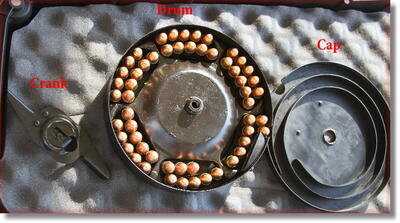 Don’t believe what you read on the internet about the 50 round drum. They are easy to load and use, but not so easy to get out of the gun due to the lack of a last round hold open feature. Click on the picture to get a bigger version. Note that this drum was loaded with 3 rounds in the last slot. Never load less than 5 per slot because as the drum turns, less than 5 flop down in the channel and can jam the drum. |