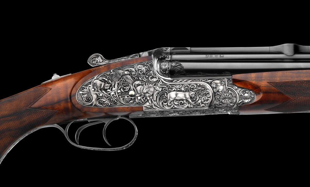 The gun also features deep-relief ornament engraving depicting a variety of animals by Johann Fanzoj’s master engraver F. Mak.