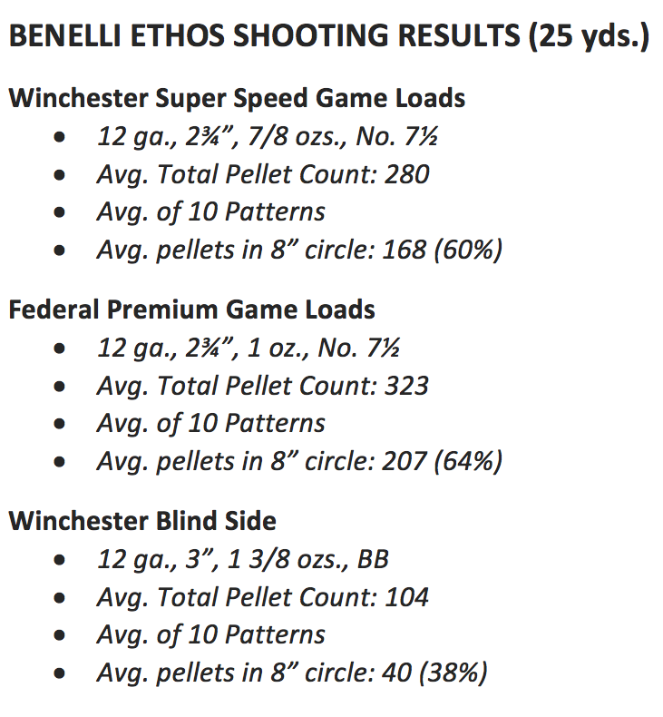 To test the Ethos, I fired 12-gauge, 2¾-inch Winchester Super Speed Game Loads with 7/8 ounces of No. 7½ shot, Federal Premium Target Loads (12-gauge, 2¾-inch as well) filled with 1 ounce of No. 7½ shot and, to try the opposite end of the recoil and shot size spectrum, Winchester Blind Side waterfowl loads. The 3-inch hulls were packed with 1 3/8 ounces of hexahedron BB-sized shot. See the chart below for results: