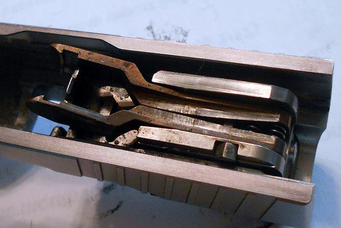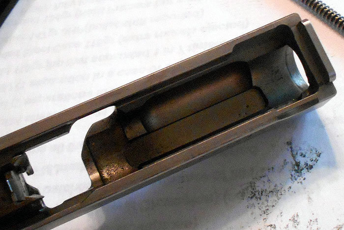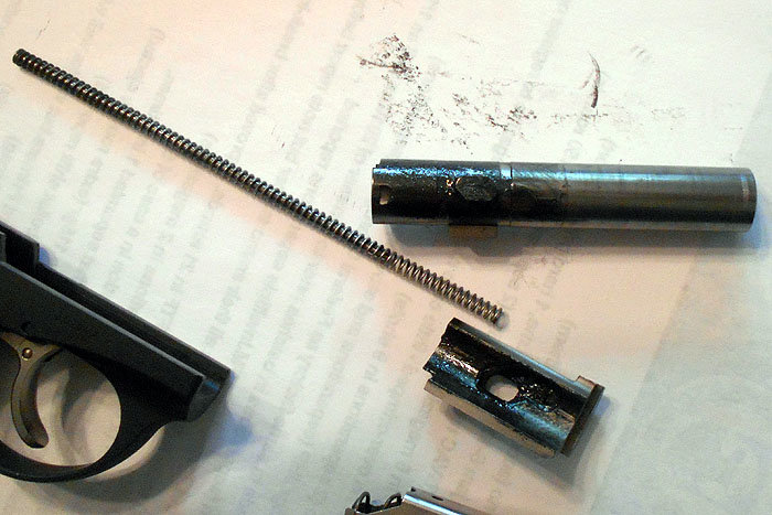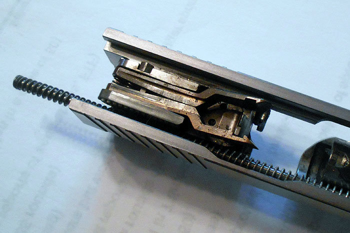 Here you can see where the thin mainspring and guide rod sit in relation to the barrel and reverse feed system.