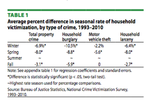 What that actually shakes out to is that compared to summer rates, household property victimization rates (which includes the three aforementioned categories: burglary, vehicle theft, and larceny) are 7 percent lower in the winter, 8 percent lower in the spring and 3 percent lower in the fall.