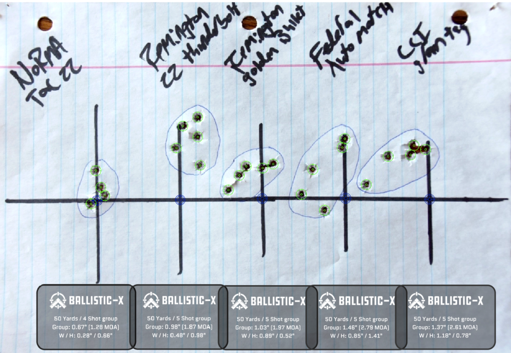 For my accuracy test, I set the ranger 22 up on a bipod and rear bag in order to be the most stable. I then set a target downrange 50 yards away. In between ammunition transitions, I sent about 5 rounds into the dirt next to the target because sometimes the residue left in the barrel by coated, or non-coated 22 LR bullets, wreaks havoc on the accuracy of the next group. The following pictures show my results: