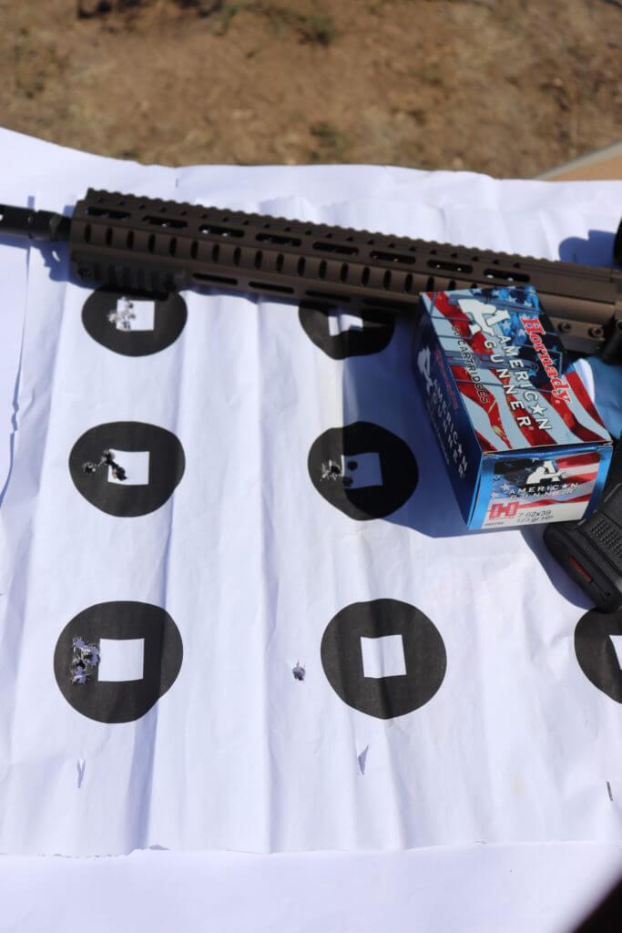 But after all that goodness, what is the test? Accuracy. I still want a gun that can hold a tight group. If I am going to an AR style action and trigger, I would even say I demand it. I had Hornady 7.62×39 on tap, which I know will do its job. I crossed my fingers as we started the grouping test using Hornady American Gunner.