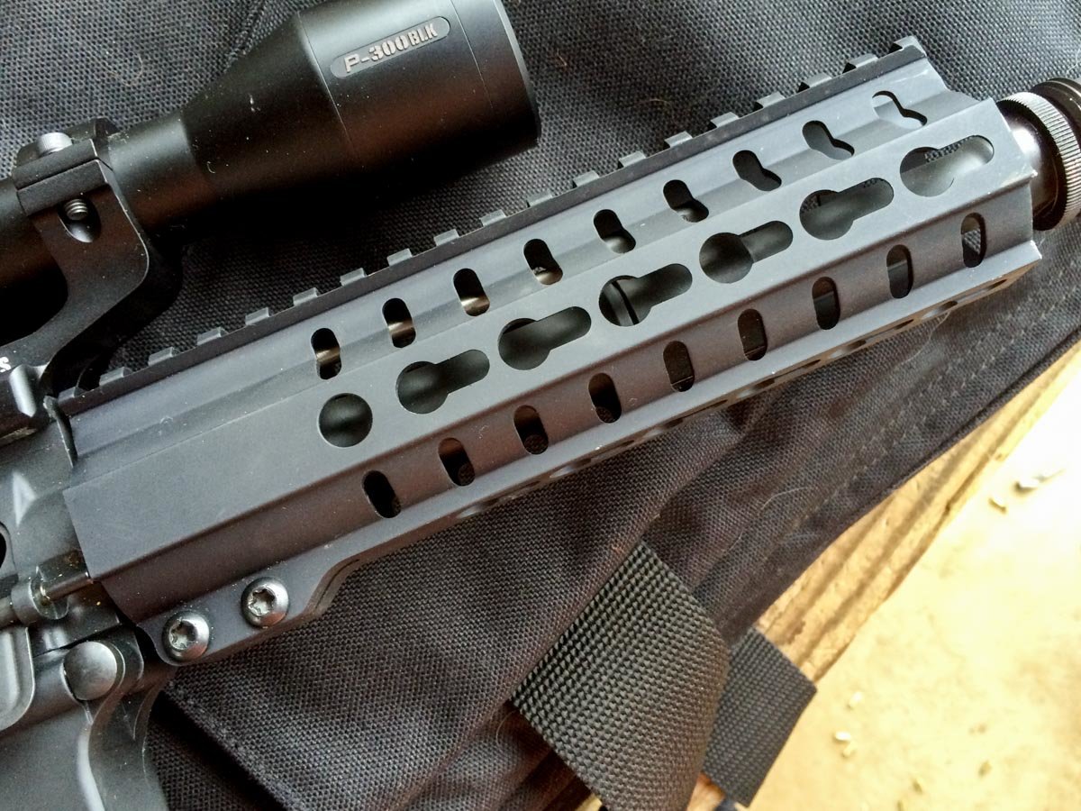 KeyMod attachment points are at the 3, 6, and 9 o’clock positions. The Picatinny rail covers the receiver and hand guard.