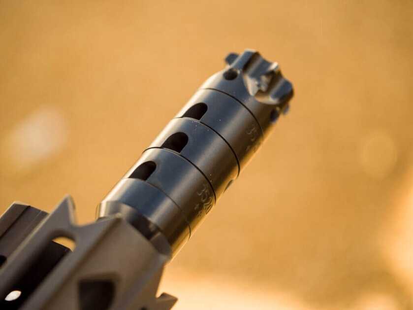 Rather than threading the end of a 16″ barrel and adding a compensator, T6 ported the end of the barrel itself and then threaded it. Then, they’ve stacked ported baffles over the barrel which can be twisted in various directions to direct the gasses coming out from the barrel ports.