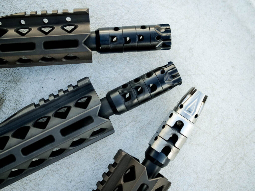 Rather than threading the end of a 16″ barrel and adding a compensator, T6 ported the end of the barrel itself and then threaded it. Then, they’ve stacked ported baffles over the barrel which can be twisted in various directions to direct the gasses coming out from the barrel ports.