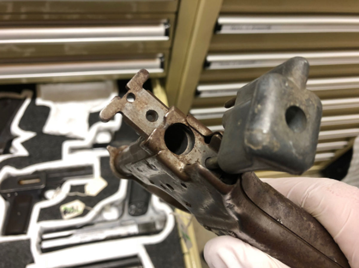 The gun was a crudely manufactured single-shot handgun sporting a smoothbore four-inch barrel. The weapon came in a cardboard box along with ten rounds of .45ACP ammunition and a small dowel to push out the empty cases.