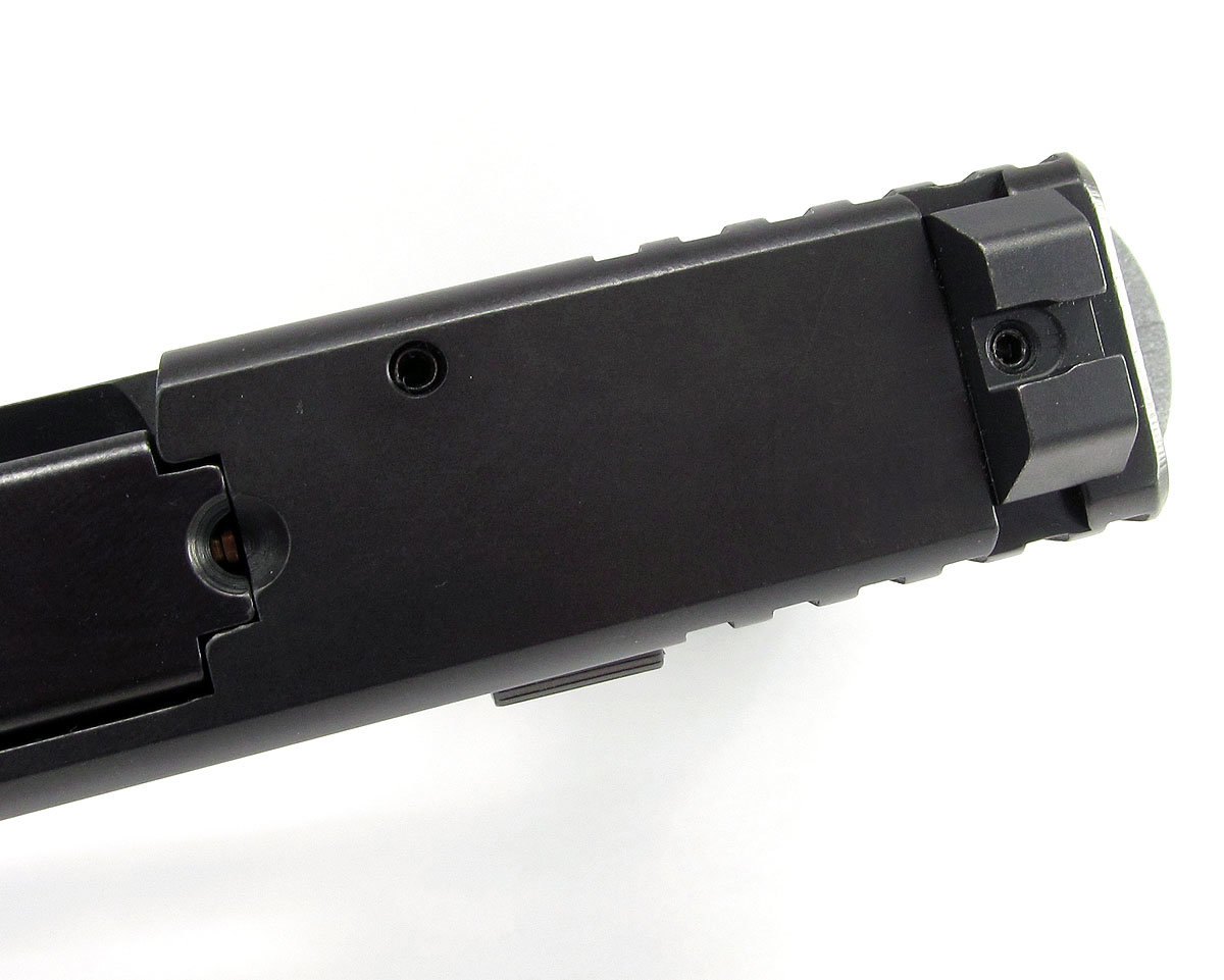 The slide features forward and rear slide serrations that are wide and deep. They provide a very positive gripping surface when manipulating the slide. Sights are of the three dot variety with the rear sight being drift adjustable for windage and locked in place with a hex screw. The ejection port is large, allowing for easy live round ejection.