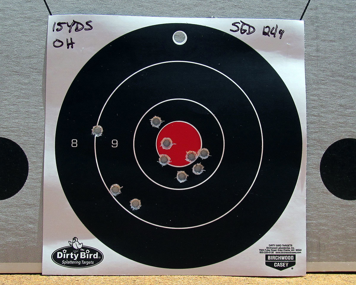 After adjusting the sights, 15 yard standing slow-fire groups were good with premium defense ammunition.
