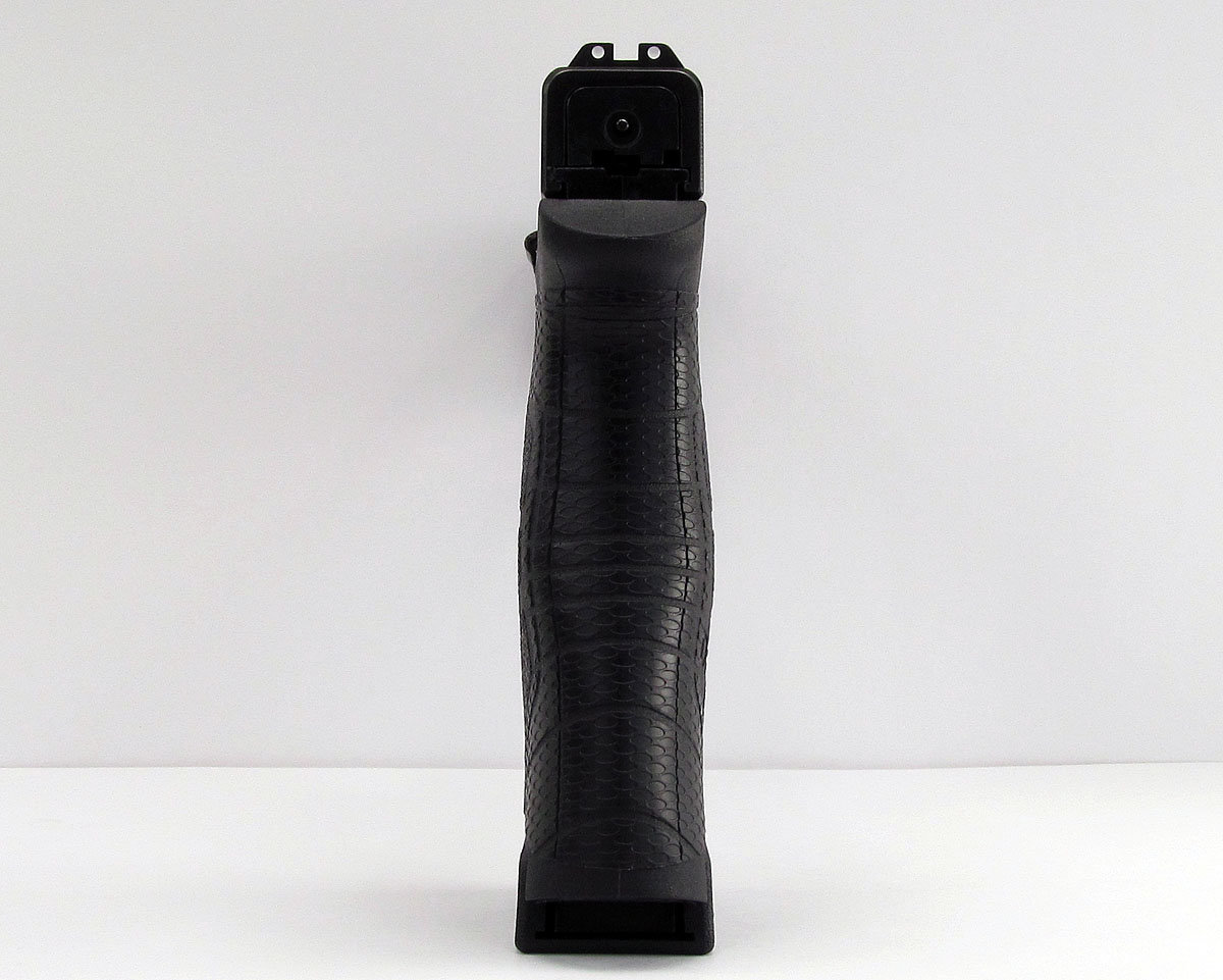 The magazine well features a rear guide, flared and beveled entry, and scalloped finger cuts. The large magazine baseplate extends under the magazine well facilitating positive magazine seating. Overall it is very well done.
