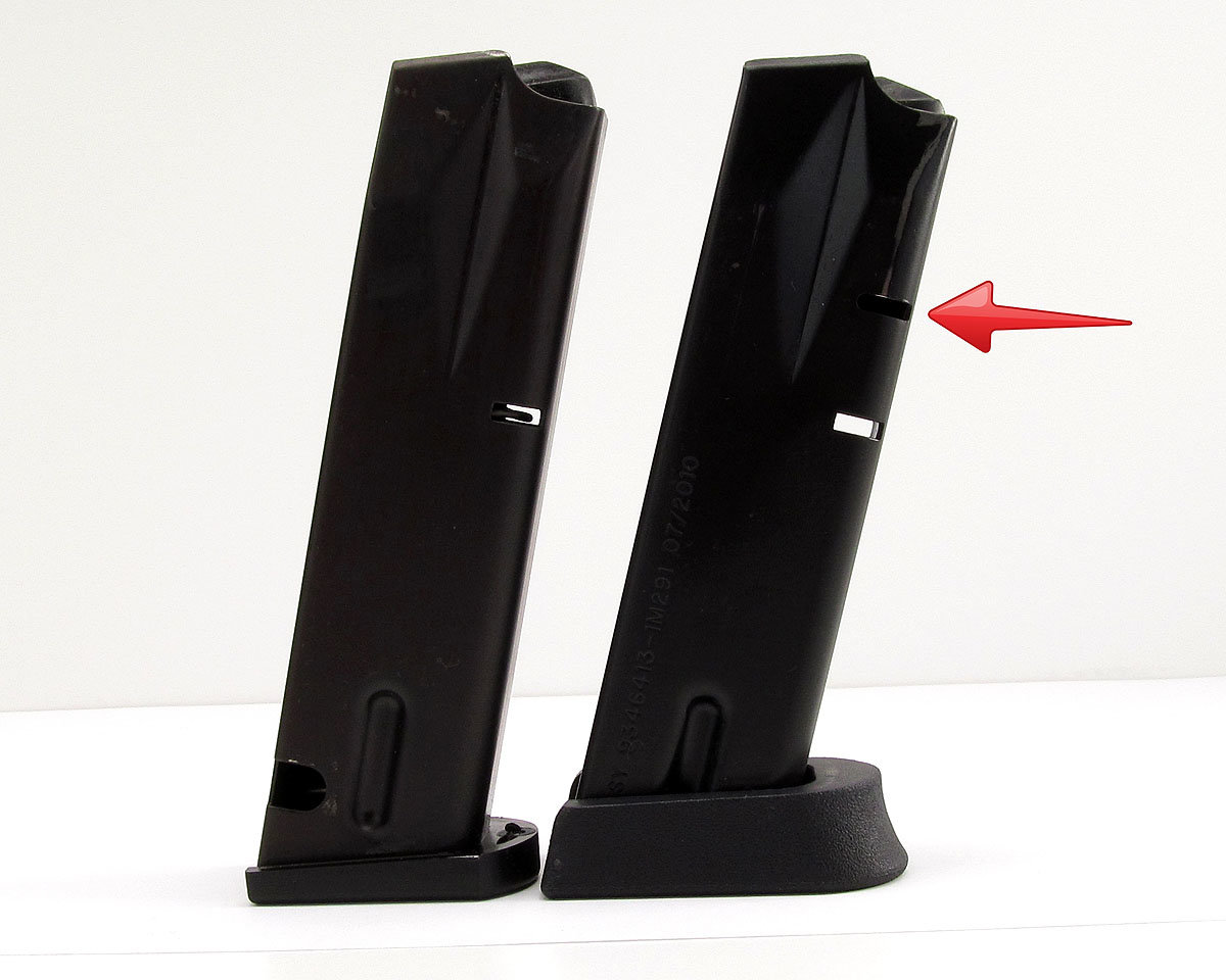 Magazines are made by Check-Mate Industries. They appear to be Beretta 92 pattern with an additional slot cut to accommodate the DB FS Nine magazine release. Beretta factory magazine on the left and DB FS Nine magazine on the right.