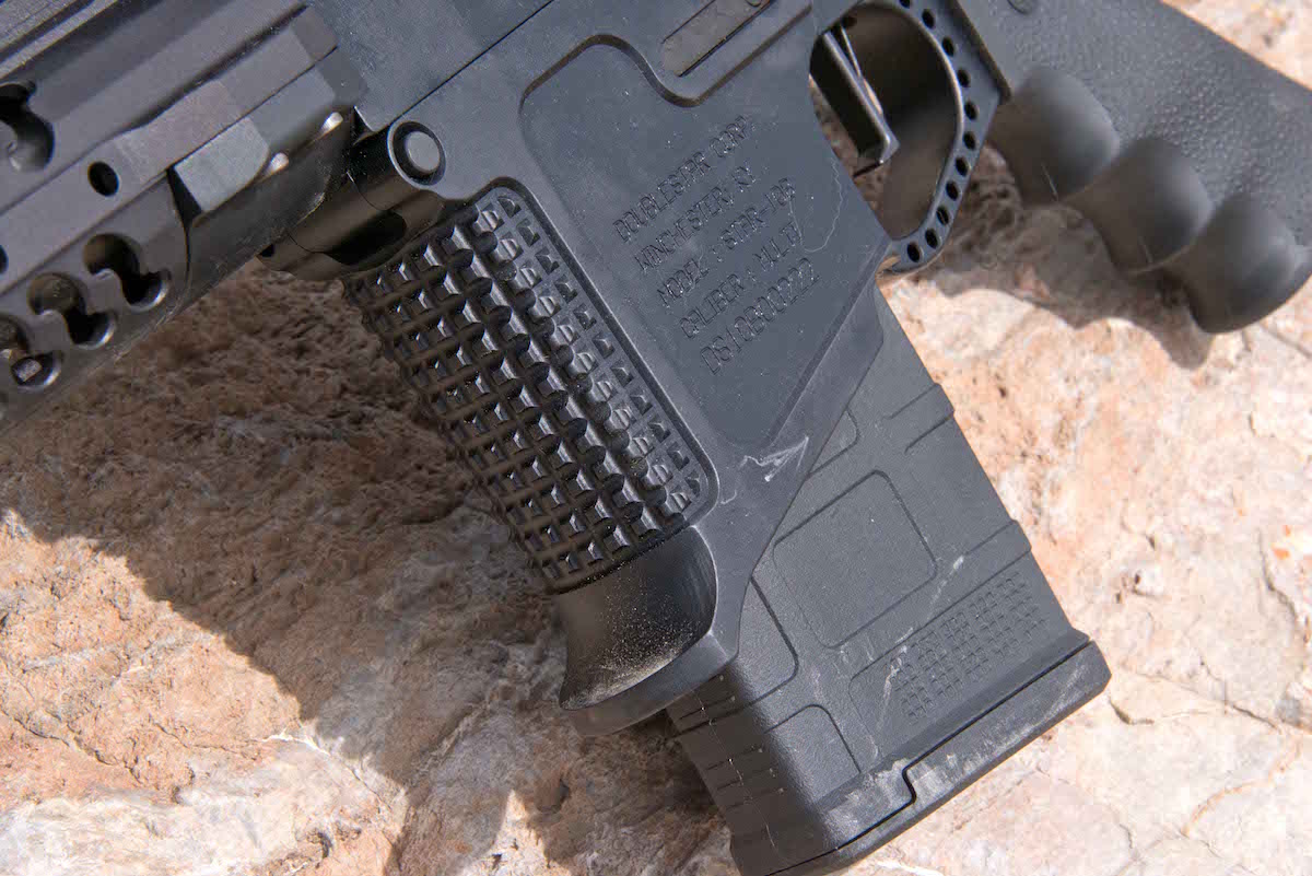 DSC’a extended magwell proved solid while working on and around the bench, on barricades and a stack of railroad ties on the range. It was possible to really lock it down, especially on wide and flat surfaces. Heavy checkering on the front digs into wood or similar surfaces. Placed on top of a bag or pack, it sits solidly as well. If you find yourself grasping the front of the magwell for some reason, it provides a nice hand hold. Not the best hold for stability, but it’s all you have at times and this makes for a solid purchase. Put on some gloves and it really locks into place.