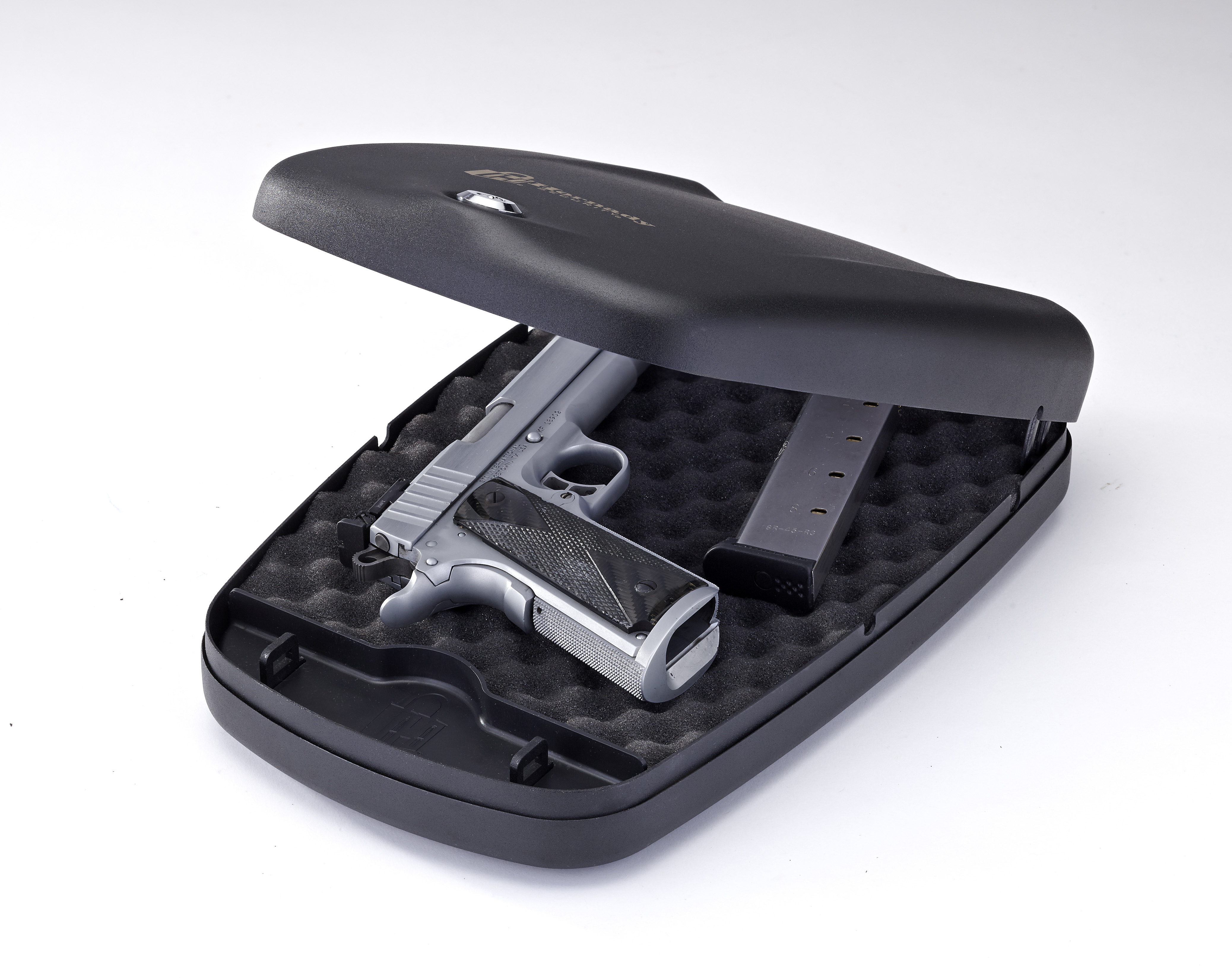 1410991171-98171-Key-Lock-Safe-2700KL-open-with-1911Safely storing your firearm is one of the key responsibilities of gun ownership. No matter how hard we try, we can’t avoid every single place that won’t allow us to carry our guns. When that happens, it’s absolutely imperative that our blasters remain secured and out of reach. The Hornady KeyLock safe 2700KL quality is perfect for vehicle storage. It also works great on road trips- store your gun securely in your hotel room when necessary, and when flying it can be locked and packed in your luggage. Retail: $59.99.