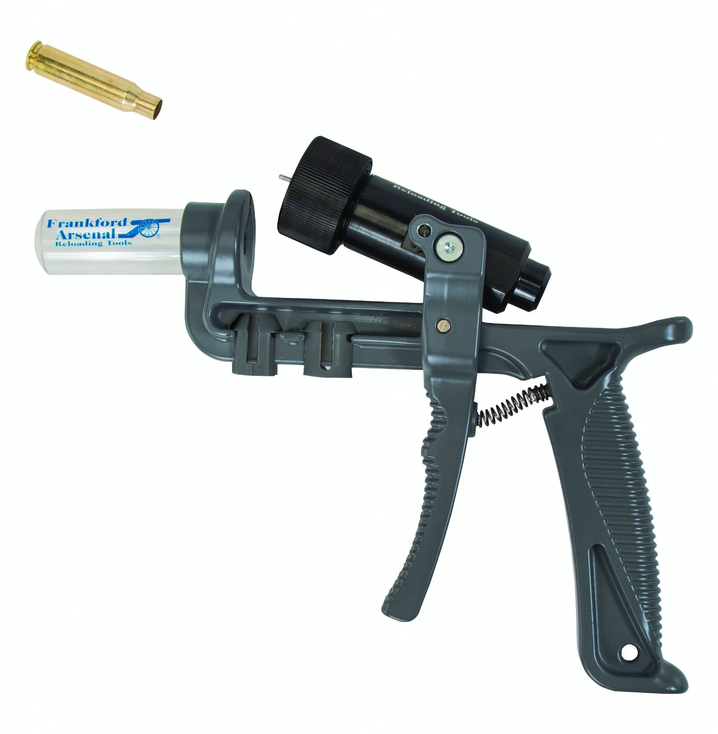 Frankford Arsenal Hand DeprimerIn just 4 easy steps you can de-prime your spent brass by hand; no need to set up your press and reset your dies just to de-prime a few cases. The Frankford Arsenal Platinum Series Hand Deprimer system is fully contained, and even captures the spent primers in a collection tube so you can dump them later. It can handle brass from .20 caliber all the way up to .338 Lapua, along with all sorts of pistol brass. This thing will even eat military-crimped primers! Retail: $37.
