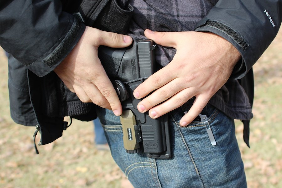 The simple fact that you can use so many extra accessories is the big selling point. But it is still a holster that has to work like a holster should, and it does. There are a couple of peculiarities that make it different, for sure. Getting the gun in and snapped in place invites an atypical movement of the gun. As I was taking these pics on the range, the range master pointed out that I was getting muzzled. My feet, anyhow. Jacob developed a holstering motion that pulled the gun a bit father back than usual, and he would also angle the barrel out a bit. I never felt like I was in danger, but I wasn’t seeing the angle the same way. This isn’t to say that that’s how a gun has to be inserted, but you have to learn a new system and its peculiarities. Re-holster, safely.