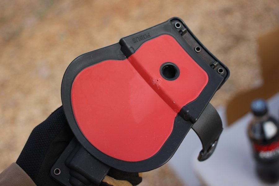 Our draw times with the snap retention strap were a bit slower than we’d hoped. We had several retention holsters on the range, and this one required the most conscious thought. But when I say slower, I mean barely. Jacob was connecting with steel with the GLOCK 19 from an open holster in about 1.2 seconds. The Fobus was closer to 1.8 seconds.