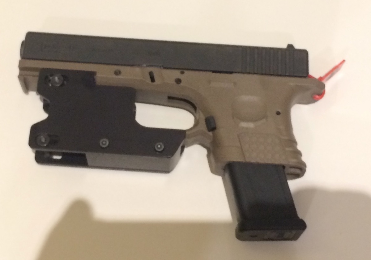 The Model 1 is essentially a magazine holder that mounts on your front rail. You cut your Glock’s trigger guard and the mag well, and a standard 10 round magazine fits in the magazine holder, sliding down to just in front of the trigger.