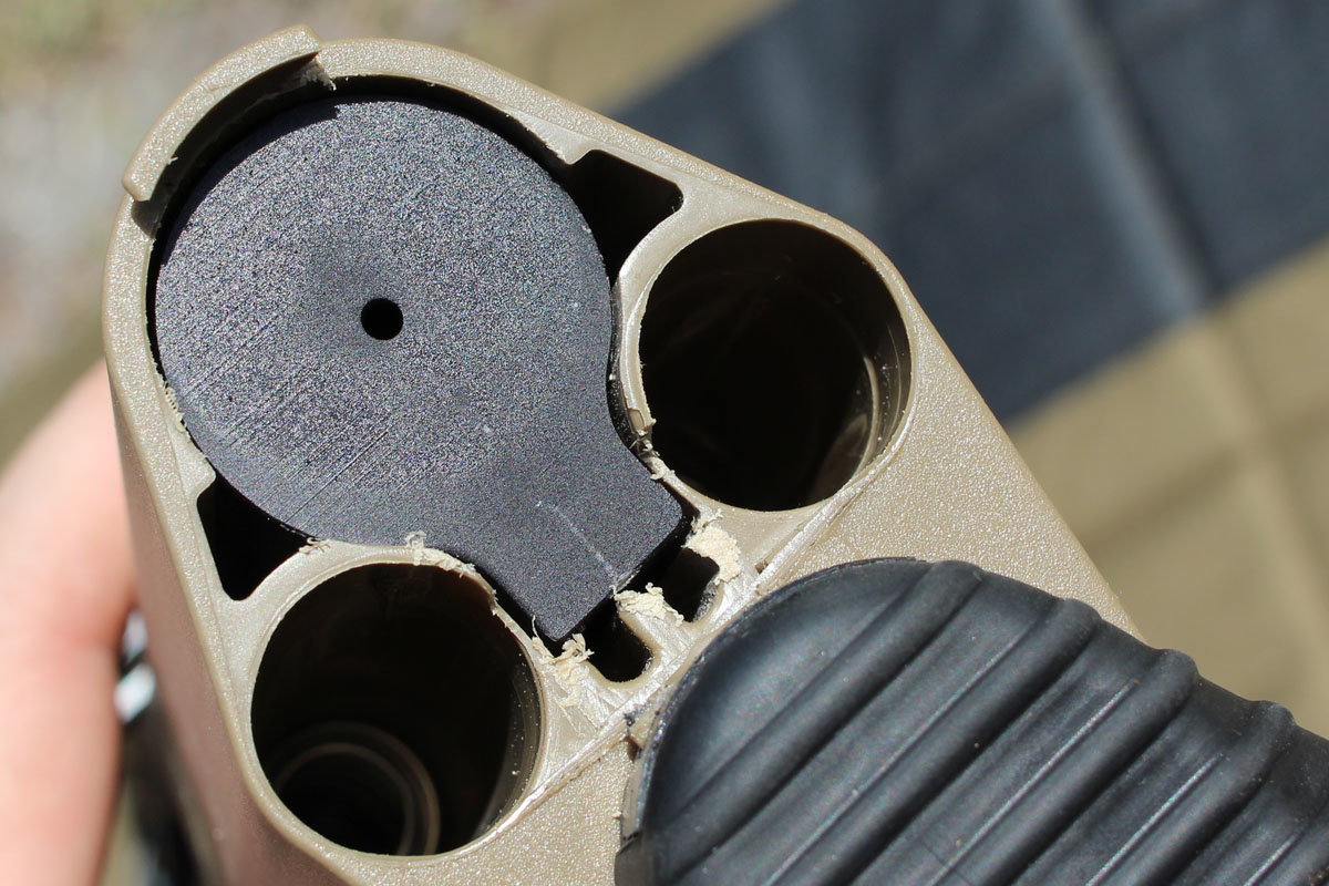 - The pad on the butt end slides off of this dovetail to open up two tubes that can hold batteries.