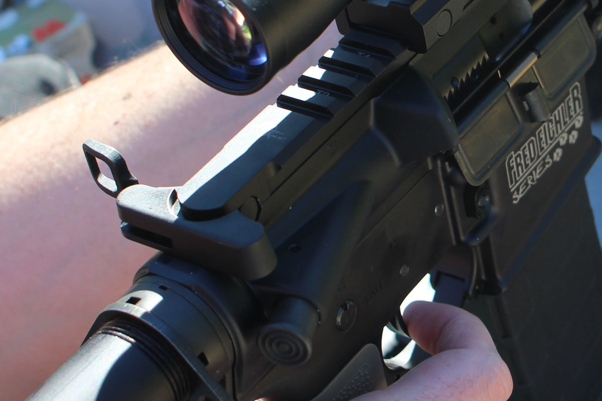 The flat top rail continues all the way down the handguard, which means you can set up optics however you’d like. If you want a scout scope forward on the rail, it will easily fit. It is an AR, so there are way too many ways to set it up. We topped it with a gem from Leupold. The magnification of the scope and the clarity of the glass helped with the accuracy testing. This is something that some folks overlook. If you are saving up to buy a rifle like this, you might be tempted to top it with a budget scope, but you’ll be doing the rifle a disservice. Save up for good glass, too.