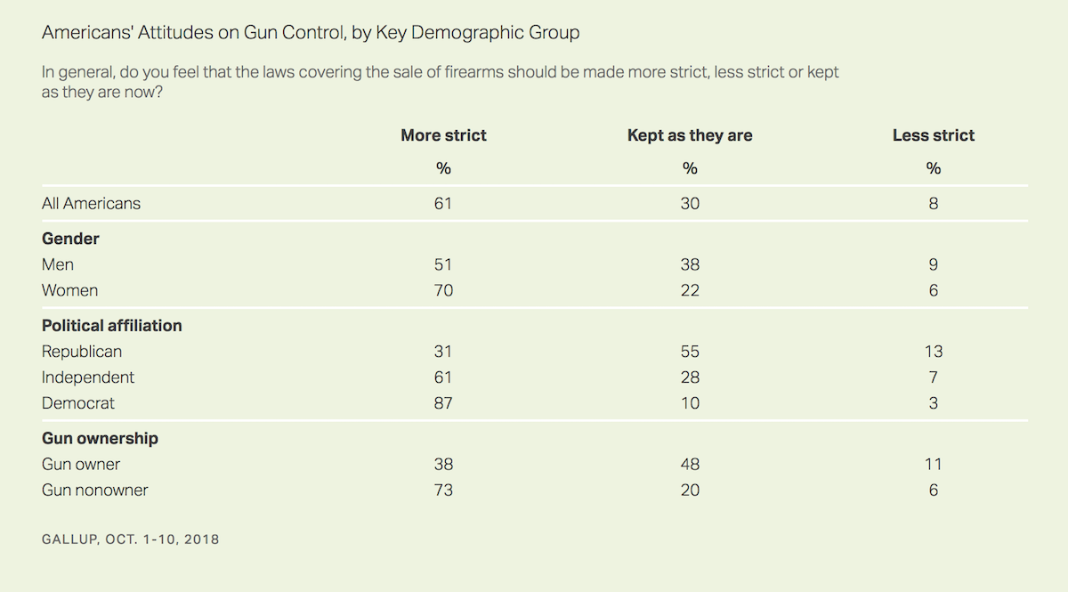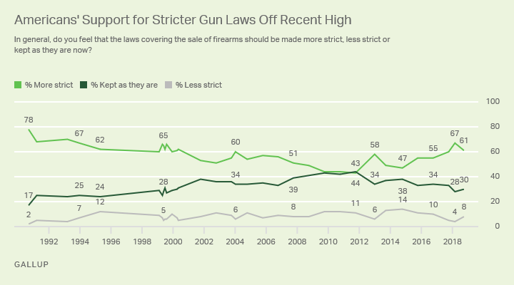 “Americans’ support for tougher gun legislation typically fluctuates, increasing in the wake of a mass shooting and dropping as memory of those horrific events fades,” stated Gallup.