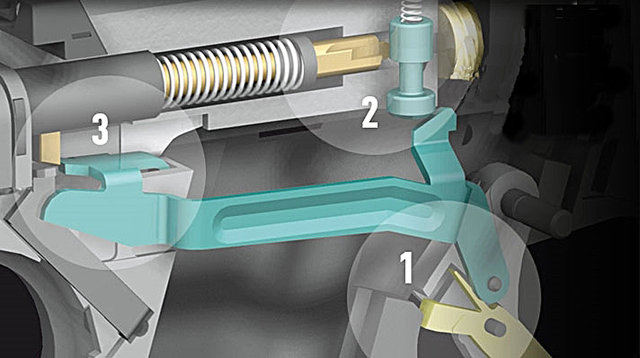 As you can see from the accompanying schematic, there is a safety lever on the trigger which locks the trigger from moving to the rear unless pressure is applied to the face of the trigger safety to move the blocking arm up and out of the way (1). This is a source of controversy that we’ll discuss in a minute. The second safety is a plunger which blocks the firing pin from moving forward to contact the primer unless the trigger is pulled (2). Finally, a shoe at the rear of the trigger bar rests on a shelf blocking the firing pin from moving until the trigger is pulled (3). This makes the gun highly drop-proof. No matter how the gun lands or the nature of the surface, even on pavement or a hard floor, the firing pin is prevented from moving as long as the trigger isn’t depressed.