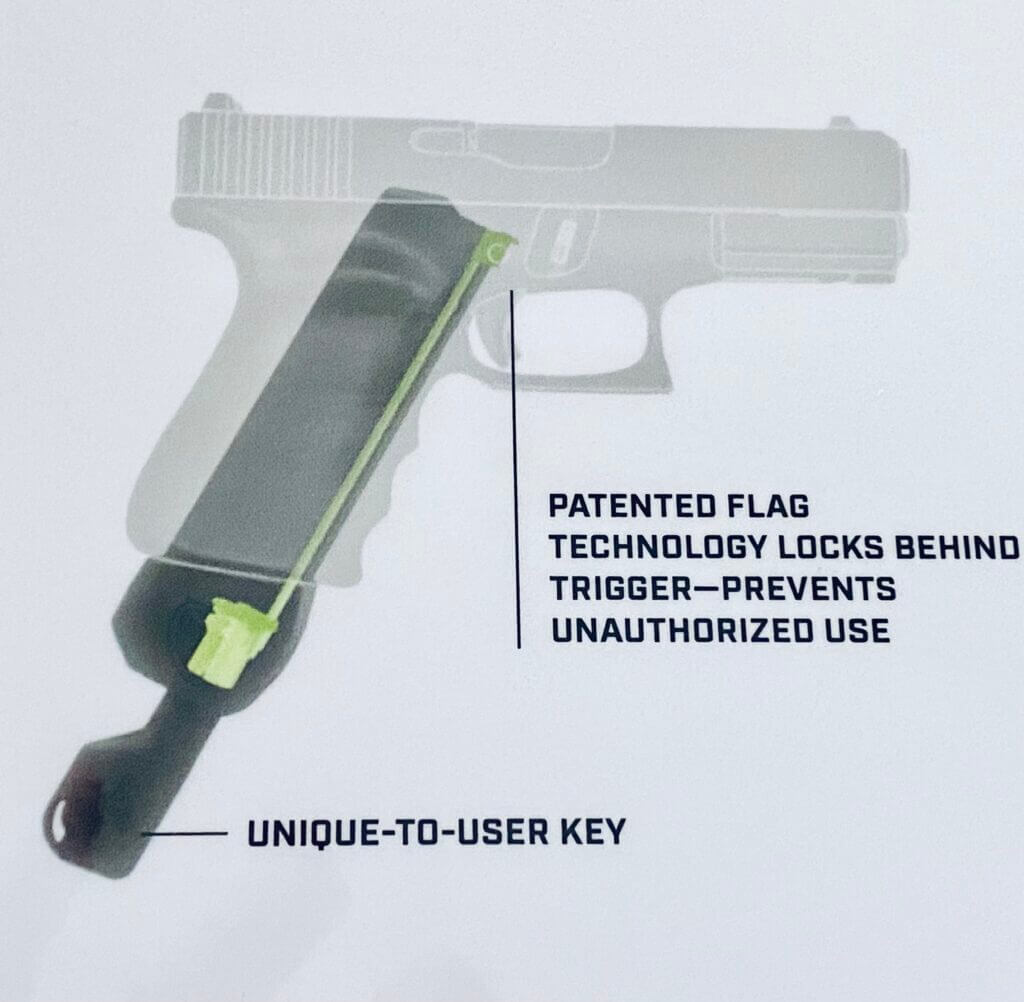 Both units use GOSAFE’s “flag” technology. Turn the key to the SAFE position with either unit and a bar running the length of the magazine flips out a small metal “flag” atop the unit. The flag blocks the trigger assembly and locks the unit into the pistol.