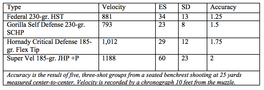We also tested Gorilla’s 230-grain Silverback load. The Silverback load consists of a CNC Swiss Turned solid copper hollowpoint (hp) bullet that is pre-scored for consistent expansion. The pre-scored bullet provides more consistent expansion and retains almost 100 percent of its original weight. In addition, the petals are thicker than a jacketed hollowpoint (JHP) and will not over expand or fold back. The Silverback load averaged a very mild 793 fps, making it the softest shooting round of the test. In previous tests, I found the Silverback will reliably expand to .7 inch or better.