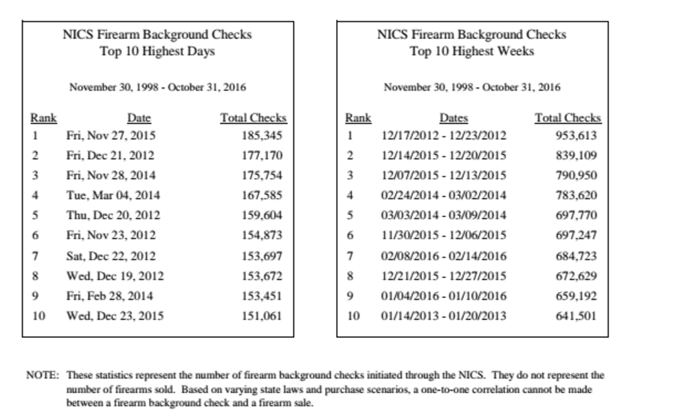 A look at the top 10 highest days and weeks for NICS checks. You’ll notice that Black Friday 2016 surpassed Black Friday 2015 by approx. 400 checks. (Photo: FBI)