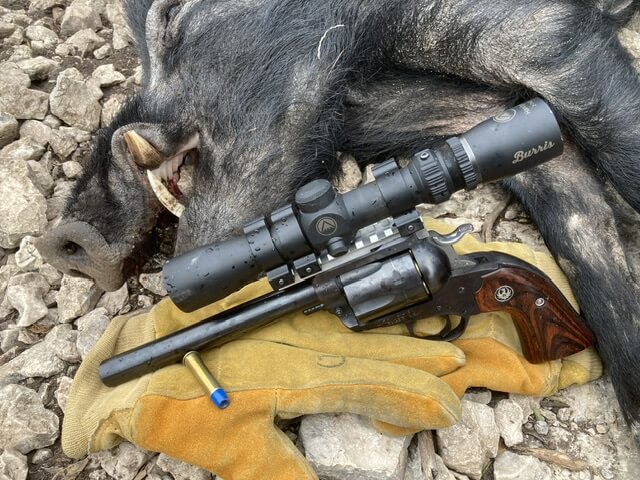One of my favorite guns for crawling through underbrush after wounded pigs is a Ruger in .500 Linebaugh. It penetrates well, so finding a bullet that expands reliably on medium game at my load’s velocity was the challenge. My loads are mild at 990 fps. The custom jacketed bullets I’ve used performed well but are expensive and require more velocity to expand. My alternate choice is a 485gr. powder-coated hollow point.