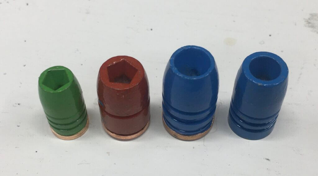 I know someone who casts and powder coats softer bullets with hollow points. At velocities of 1000-1200 fps, they perform very well. I’ve also used them at higher velocities, and they’re effective. When I settle on a bullet that works for me, I buy at least 500, knowing I’ll be set for a while. Cast bullets tend to be cheaper than jacketed ones, and finding a good home caster makes them even more affordable. Matt’s Bullets is one small outfit that offers excellent products. His site lists suitable velocities and includes photos of bullets at various velocity levels.