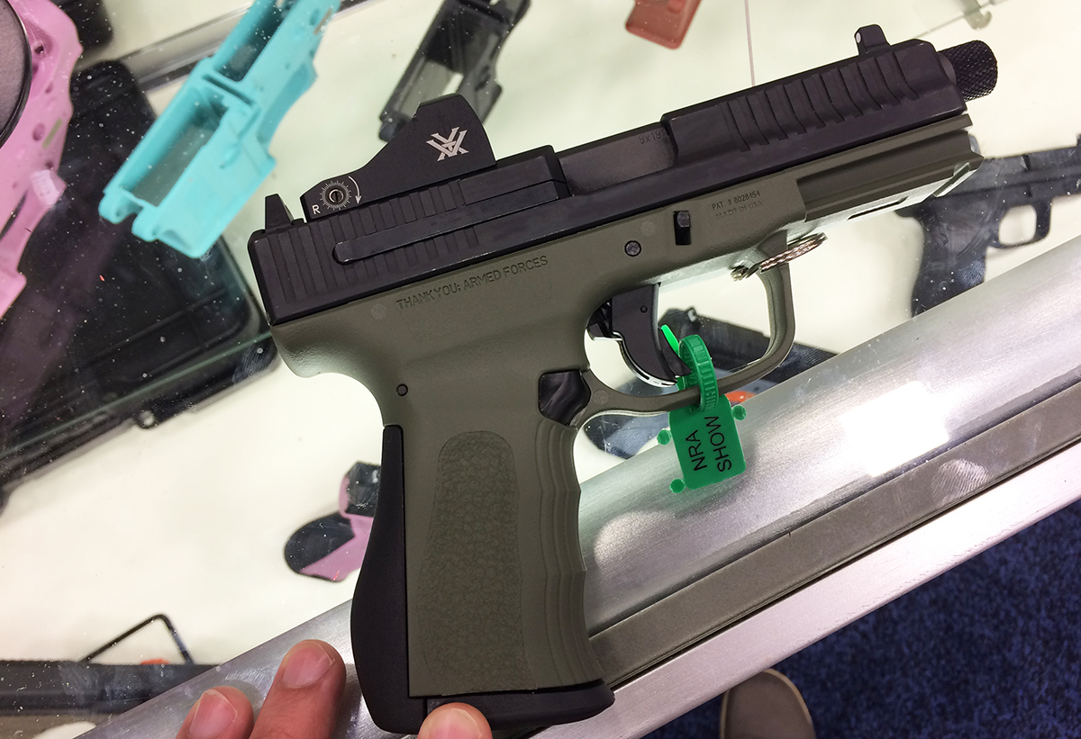 This is a flat dark earth Elite Pro with a Trijicon RMR. The RMR is not available from FMK, but the company reps told us the slide cut-out will work for that optic as well.