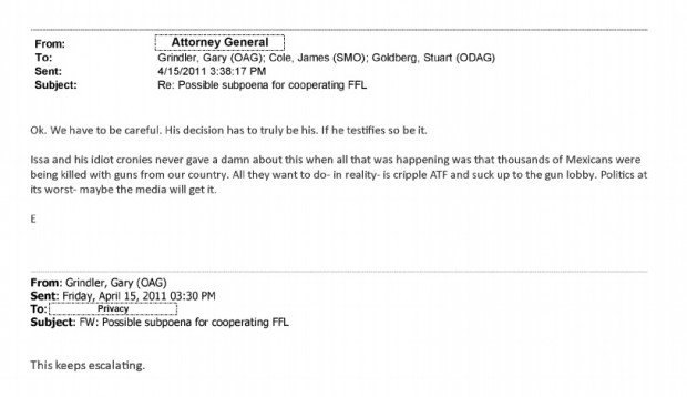 In the email, Holder responds to DOJ official Gary Grindler who wrote, “This keeps escalating,” with respect to Issa’s plan to subpoena former Associate Deputy Attorney General Matthew Axelrod to testify.