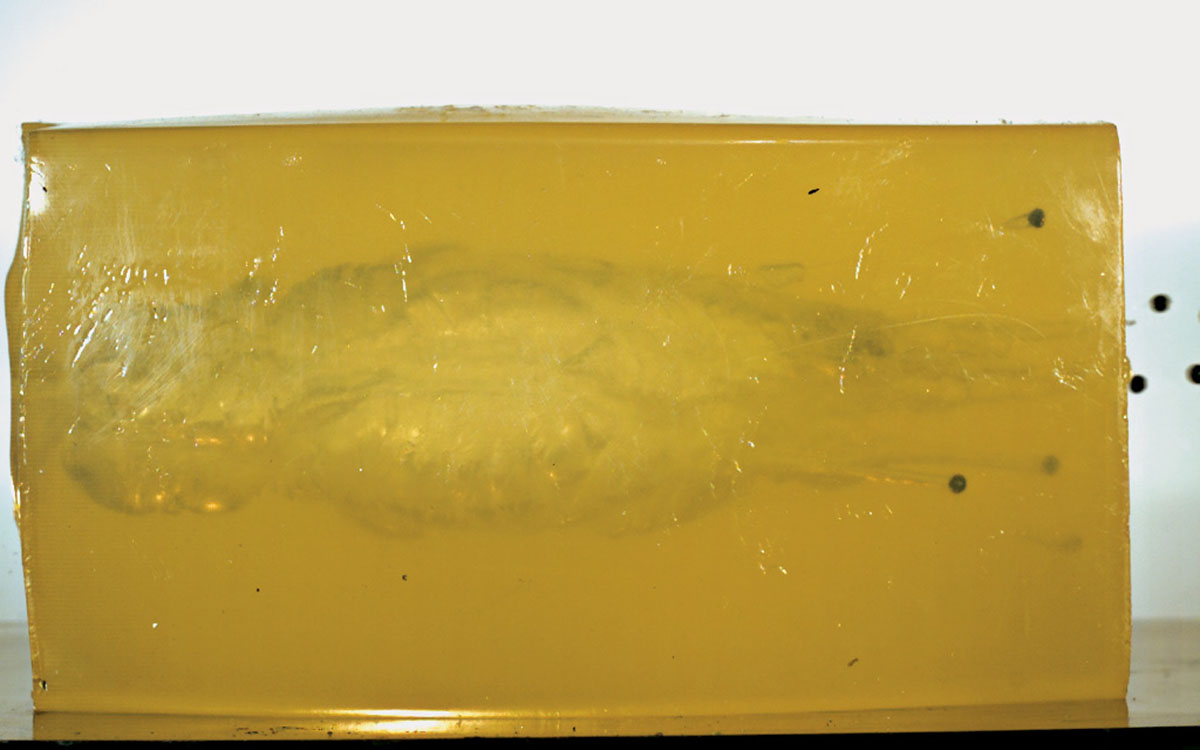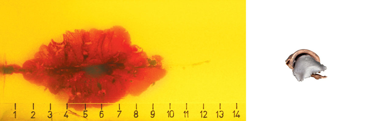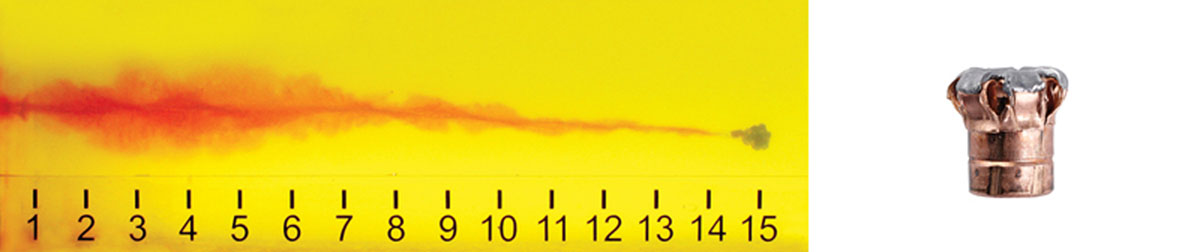 This is a wound track and recovered projectile left when a Hornady (www.hornady.com ) 9mm Critical Duty 135-grain FTX round is fired into bare ballistic gelatin. The bullet penetrated 15.25 inches and the maximum width of the wound cavity was 2.25 inches. (Image courtesy of Hornady)