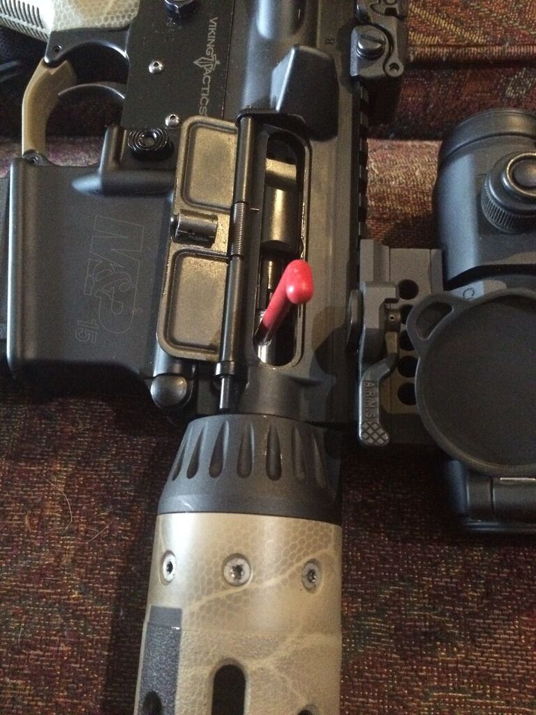 Then to load the gun you simply pull the exposed red handle and it cycle the bolt and load the first round out of the magazine.