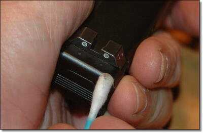| Gun cleaning can be a pleasure or chore, depending on how you look at it. The tools and cleaners available today are staggering, but leave a lot of choices for the consumer. Blued guns like this look beautiful, but they need a little more TLC than some of the more modern finishes. The area where aftermarket sights meet the slide can be an area where rust sneaks up on you. Q-tips can really get into this corner and get the crud out. Revolvers, while less maintenance intensive with such items as springs, etc., still need periodic maintenance and good cleaning when you shoot them. I use Q-tips or other cotton swabs to reach a lot of hard to reach places. They absorb dirt/grime nicely. |