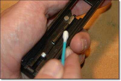 On an auto-pistol, where you are taking the barrel out of the gun before cleaning it, clean it from the back, and use your toothbrush or other hard bristle brush on the feed ramp to get it nice and shiny. Crud can build up on it and this is a primary cause of failures to feed.