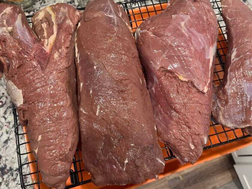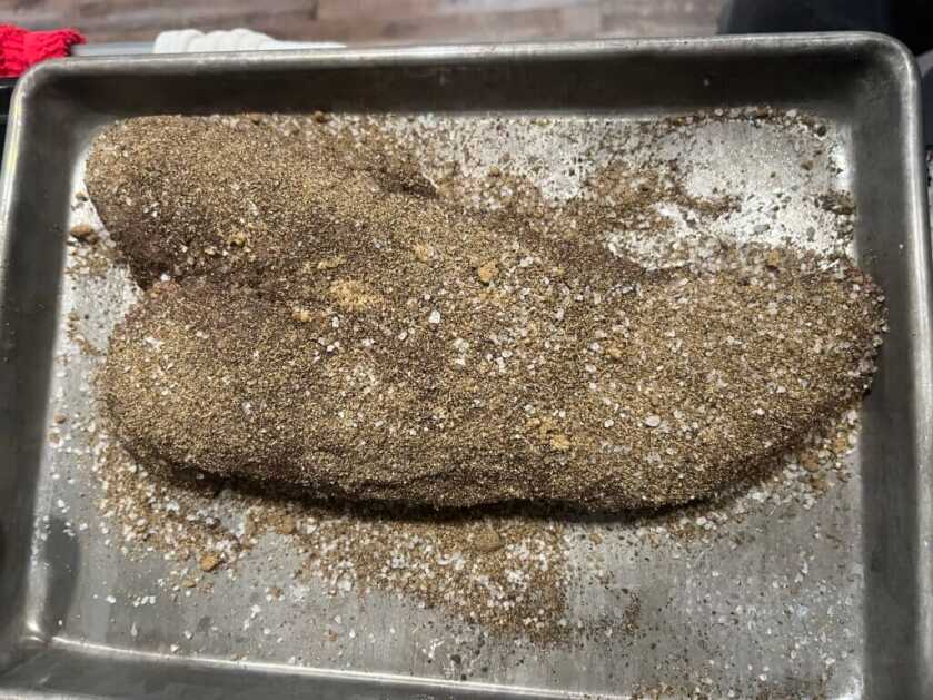 The difference between corned elk and elk pastrami is the smoking. And the rub. The rub is proportional, so one part of pepper to one part sugar, etc. It just depends on how much meat you’re doing. I started with one cup of black pepper, and I ended up with about 1/3 leftover after these four pieces of meat. I put the leftovers in a container to use next time. So, I’m writing it as one cup, but you could do 1/2 cup for less meat and do alright. Just be sure you pack it on.