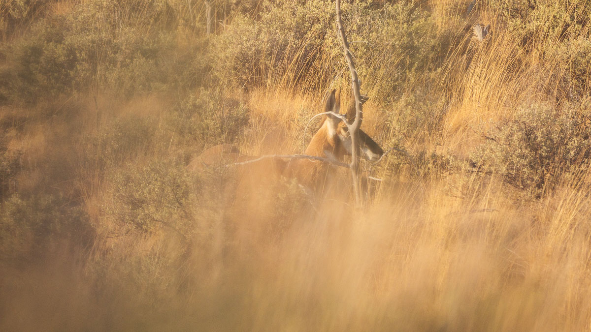 Why not make more mistakes? I ran after him with the sun setting in my eyes. The yellow bushes were backlit and wildfire haze made the sun burn red on the horizon. Tripod’s horns were silhouetted against the blazing sunset. It was gorgeous. I tried to run parallel to him and get ahead, but Tripod was staring straight at me again from 80 yards. A pronghorn buck staring straight at you is disconcerting: the black fur on his face melds perfectly with his horns and it gives him a powerful and menacing expression. He seemed to be saying, “Are you kidding me? Just leave me alone to die!”